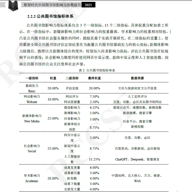 公共图书馆影响力指标体系包含5个一级指标、15个二级指标,具体权重分配如图所示。