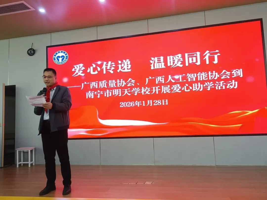 禾苗沐阳而长,童心载梦前行。在2026年春节临近之际,为让缺少父母关爱的孩子感受到社会大家庭的融融暖意,1月28日,广西人工智能协会联合广西质量协会走进南宁市明天学校,开展“爱心捐赠润桃李 质智科普筑梦想”公益慰问活动。以物质帮扶传递温情,以趣味科普播撒希望,为孩子们的成长之路注入温暖力量。