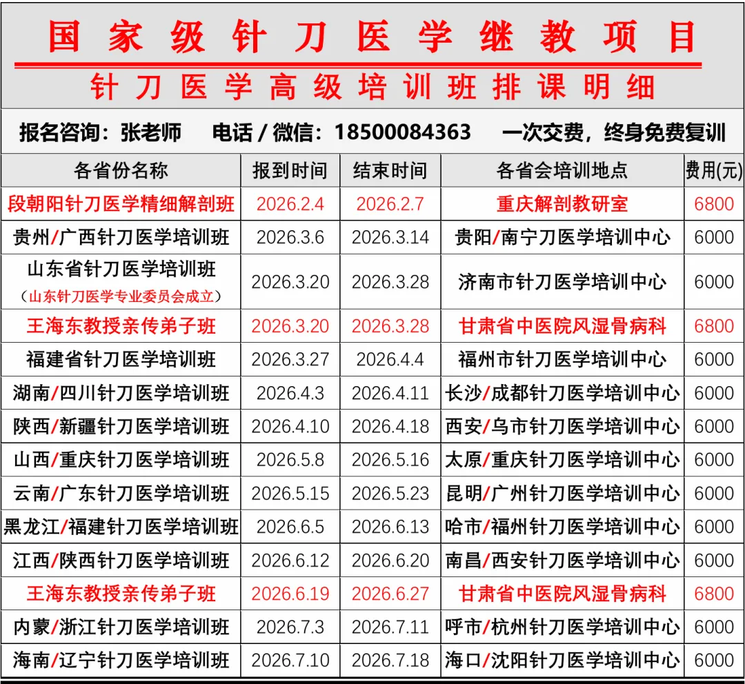 下 肢 部 | ①针刀治疗膝关节内侧副韧带损伤 ②针刀治疗髌韧带损伤 ③针刀治疗膝关节骨性关节炎的诊断与治疗方法 ④针刀治疗髌下脂肪垫炎 ⑤针刀治疗髌骨软化症 ⑥针刀治疗跖管综合症 ⑦针刀治疗跟骨骨刺 ⑧针刀门诊治疗、示教 | 第七天(全天) 星期五 |