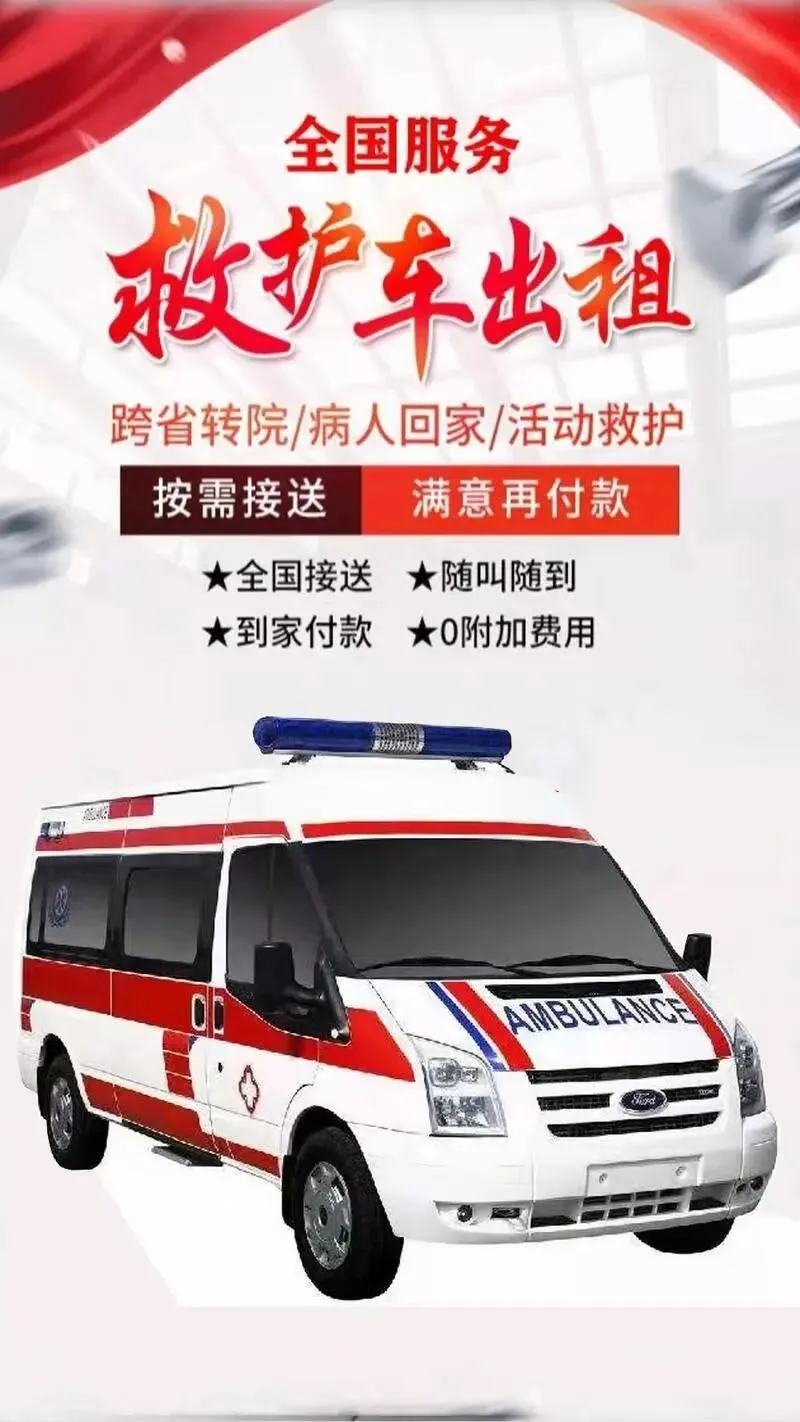 我们是救护车出租转运公司,120救护车接送病人预约护送。24小时为术后康复、危重患者及跨区域就医人群提供专业医疗转运服务,提供120救护车转运出租‖救护车转运‖私人120救护车(非急救)‖跨省长途转运‖危重病人转运‖市内转运‖术后康复病人转运‖高铁病人转运‖患者返乡‖大型活动赛事保障‖配备ICU设备:呼吸机▪心电监护仪▪吸痰器•微量泵•氧气▪急救药箱▪专业医护团队24小时服务热线:15088098120(←长按复制,微信同号)官方网站:http://www.120ajhs.com/