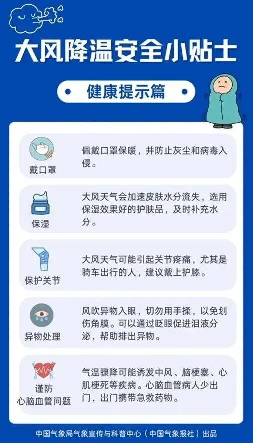 1.降温叠加大风,体感温度可能因“风寒效应”再降一级,再加上降雨,体感更为湿冷,提醒大家务必注意防寒保暖,尤其是患有呼吸道疾病和心脑血管疾病的朋友更加需要注意。