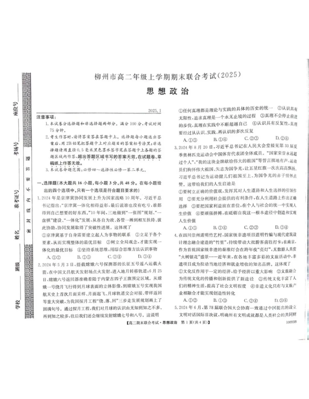 当前位置:首页>柳州>【广西壮族自治区柳州市2024-2025学年高二上学期1月期末联合考试政治试题
