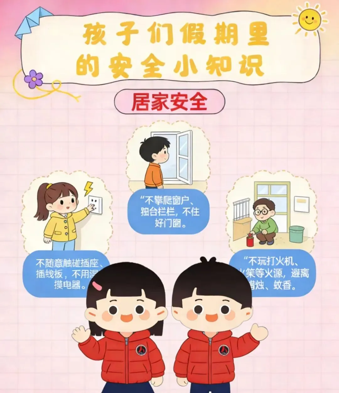 3. 教育孩子不攀爬窗户、阳台、护栏等高处,防止坠落;不向窗外抛掷物品,避免伤人。