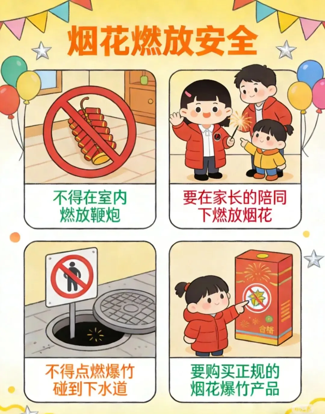 2. 选择正规渠道购买,不买三无、劣质烟花爆竹,不玩危险品类。
