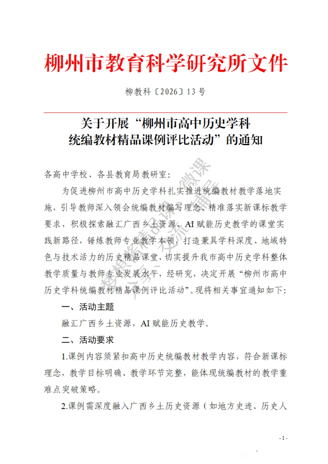 >柳州市开展“高中历史学科统编教材精品课例评比活动”的通知