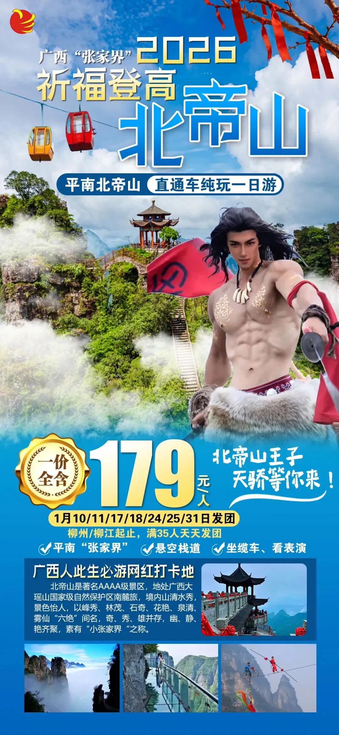 1月31日(已经成团,有位)北帝山直通车纯玩一日游179元/人(含门票缆车区间车)