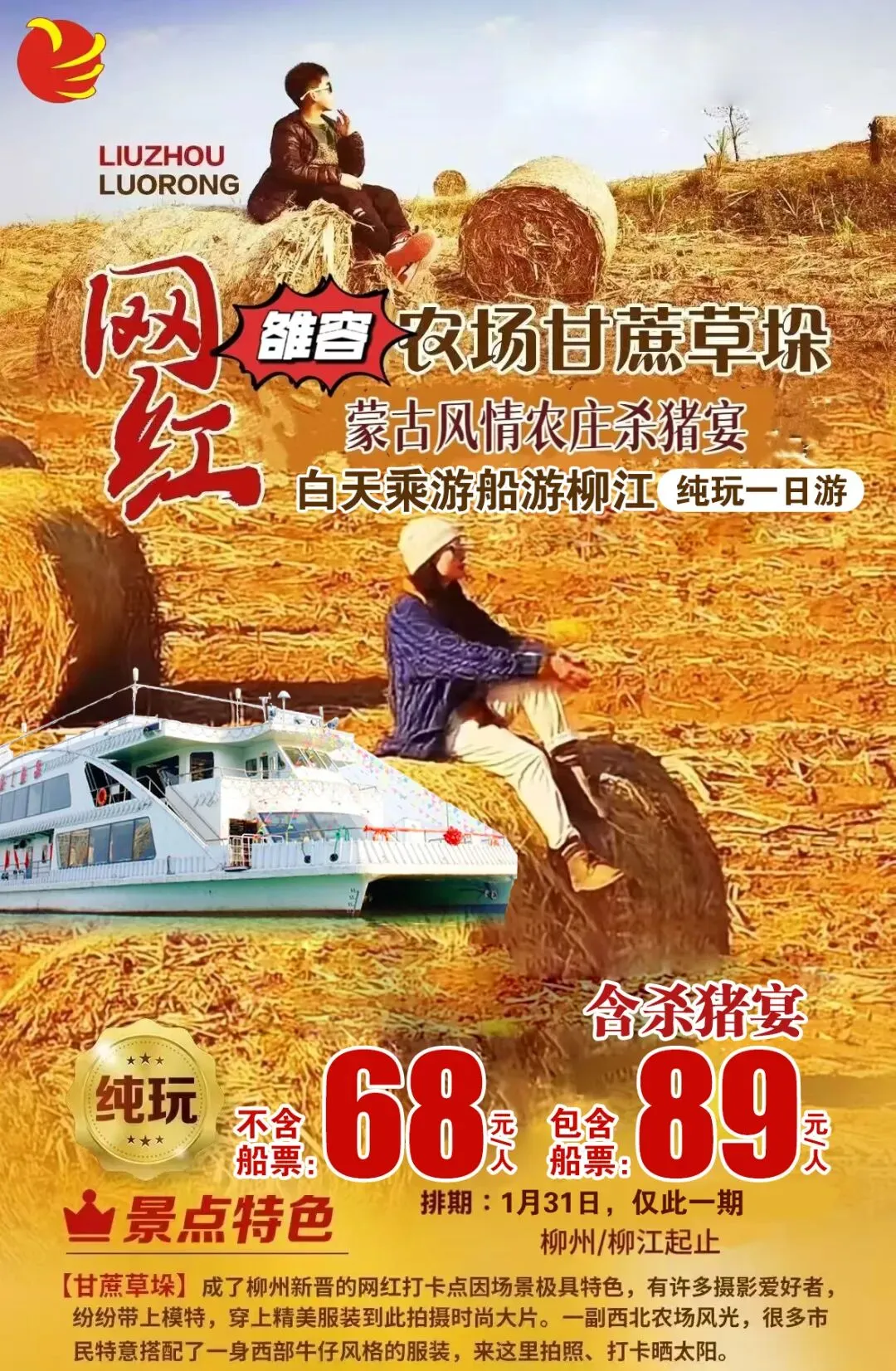1月31日(已经成团,有位)雒容网红甘蔗草垛➕杀猪宴纯玩一日游68元/人(含杀猪宴)