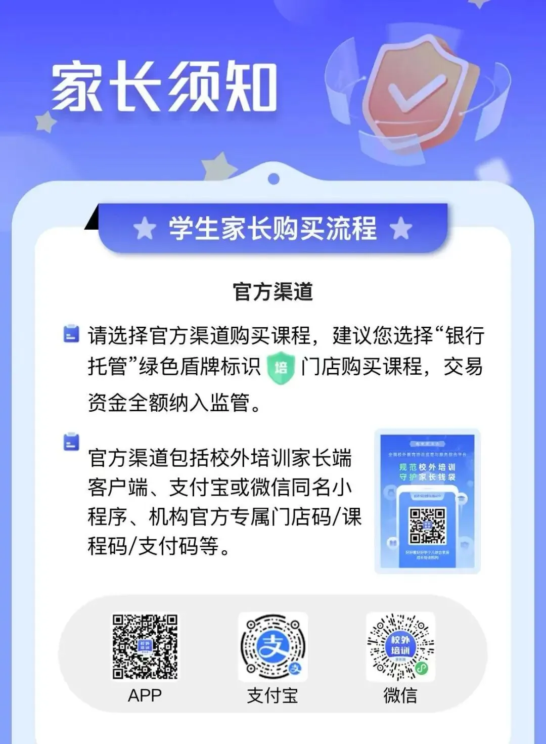 为维护广大学生和家长的合法权益,教育部推出了“全国校外教育培训监管与服务综合平台”,该平台同步推出的“校外培训家长端APP”,家长可通过该APP在“掌上”选机构、选课程、缴费、消课和退费。购课预付费先到银行监管账户,家长与培训机构按照“一课一消”规则划拨培训费用。家长的合理退费请求也可通过该APP申请,将按照合同约定时间将预收学费原路返还,有效解决“卷钱跑路”“退费难”等问题。