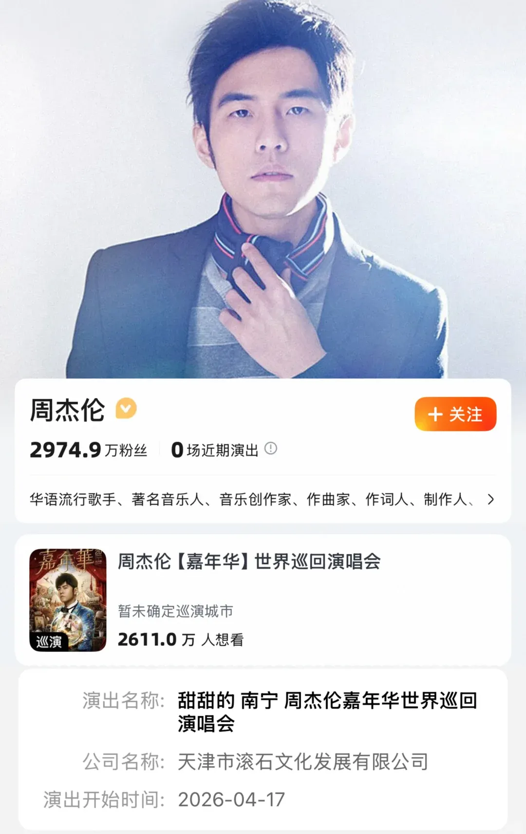 1.周杰伦南宁站场现已筹备中 演唱时间在2026年4月17日,大概率三场连开,按照以往来看 开票时间在演出前一个月