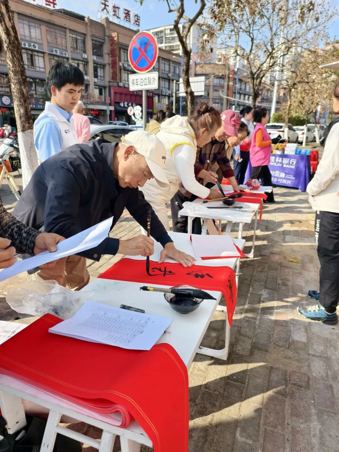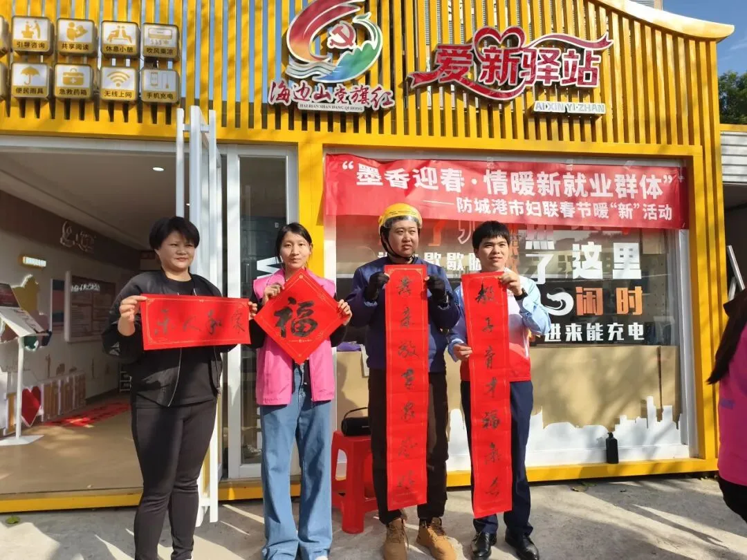 1月27日下午,防城港市妇联在迎宾路与永福路交汇处的“爱新驿站”开展“墨香迎春·情暖新就业群体”新春送福活动,为快递员、外卖骑手、环卫工人等新就业形态劳动者送上新春的关怀与祝福。活动由东海湾社区居委会、防城港市弘远社会工作研究发展中心及“金花姐姐”志愿者服务队共同承办。