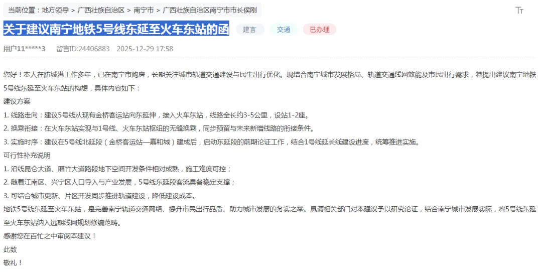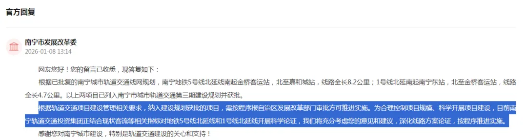近日,有网友在人民网领导留言板上建议“南宁地铁5号线东延至火车东站”构想建议,南宁官方也回复了。网友的建议,其实在南宁市城市轨道交通第三期建设规划中已经确实线路,就是地铁1号线北延线北至金桥客运站,与地铁5号线驳接。至于何时建设,南宁市发展改革委答复“需按程序报自治区发展改革部门审批方可推进实施”、“目前南宁轨道交通投资集团正结合现状客流等相关指标对地铁5号线北延线和1号线北延线开展科学论证”。写在最后:南宁市城市轨道交通第三期建设规划是在2024年获批的,如何两年了,在建的仅地铁6号线,其实线路都还在前期准备,期待未来南宁的地铁网络更加完善。