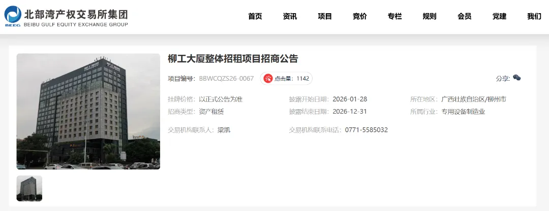 据公告信息披露,柳工大厦地面1层至16层以及地下室,整体总建筑面积约3.16万平方米建筑公开招租,具体租赁价格仍待正式公告披露。