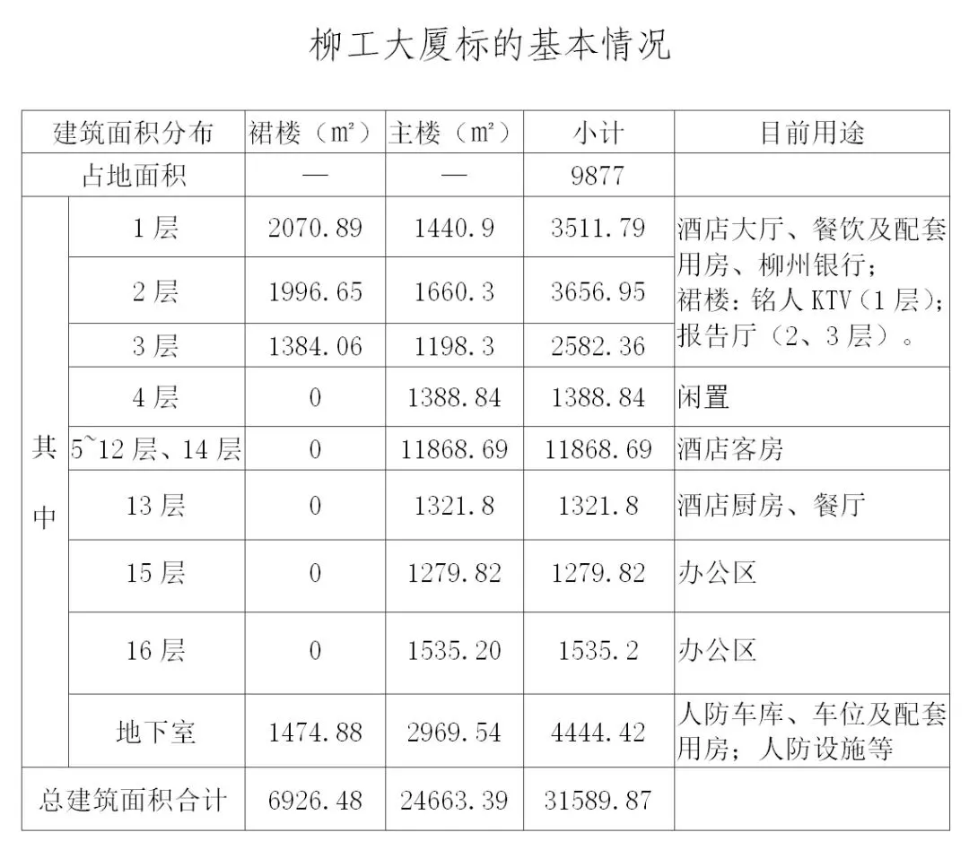 柳工大厦产权属于广西柳工集团有限公司,2008年建成并营业至今。大厦总建筑面积约3.16万平方米,地下1层,地上16层,标准层每层建筑面积约1300平方米,标的裙房部分为2层的综合会议厅,主楼为集商业、办公等于一体的综合楼。