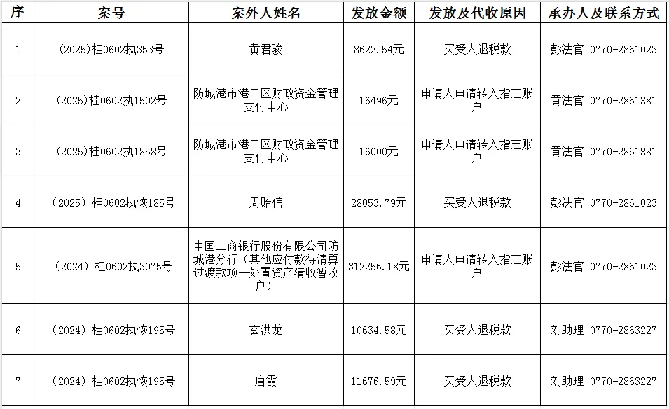 防城港市港口区人民法院关于向案外人发放执行案款的公示(2026年 第四期)