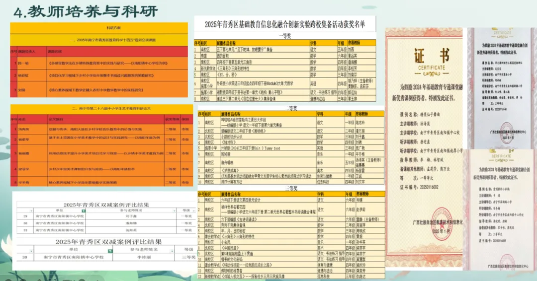 教师专业成长:坚持“引进来、走出去、传帮带”三位一体模式,全方位赋能教师专业成长。一方面,邀请多位学科专家到校指导,每学期常态化组织教师外出参学取经,拓宽教育视野、更新教学理念;深化师徒结对机制,2025年结对青年教师32对,通过以老带新、示范课、磨课研讨等方式,助力青年教师快速站稳讲台、提升教学能力。另一方面,积极搭建展示与提升平台,推送教师参与各级教研实践,12位教师承担城区教研公开课或团队教研任务,凭借过硬教学素养获得一致好评;组织语数英学科教师参与城区教研室春秋期末复习教研活动,惠及教师94人次,显著提升复习针对性与有效性。同时,以科研赋能教师成长,2025年申报的3个城区课题全部立项;4篇“双减”案例中3篇获一等奖、1篇获三等奖;5篇科研论文中3篇获市级二等奖、2篇获市级三等奖;33位教师在青秀区基础教育信息化融合创新实验数字集备活动中获奖(一等奖10人、二等奖11人、三等奖12人);2位主备教师在自治区基础教育专递课堂融合创新优秀课例评选中获一、三等奖,5位助教老师获一等奖、4位获二等奖、2位获三等奖,以科研促教学,实现教师专业能力与教学质量同步提升。