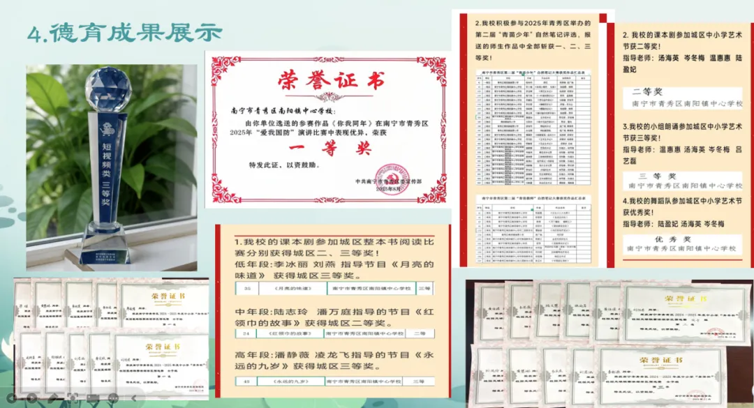 在丰富的德育实践中,学生综合素养显著提升,指导学校合唱队获城区比赛中游名次;指导学生参加爱国主义演讲比赛获城区一等奖,课本剧获城区二等奖;指导情景剧《向毒品说不》获南宁市三等奖;指导学生朗诵、舞蹈节目分别获城区三等奖和优秀奖;统筹指导教师带领学生参加青秀区整本书阅读比赛,1个作品获二等奖、2个获三等奖、2人获第二届青苗少年自然笔记大赛一等奖、11人获二等奖、22人获三等奖、大课间评比获城区三等奖、参加城区科技节比赛,"鸡蛋撞地球"获城区二等奖。