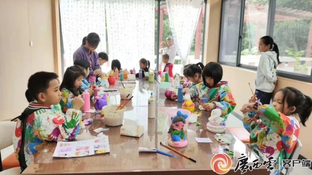 孩子们在公益美育课堂中进行石膏彩绘创作,用色彩表达创意。图源:青秀区中山街道人大工委