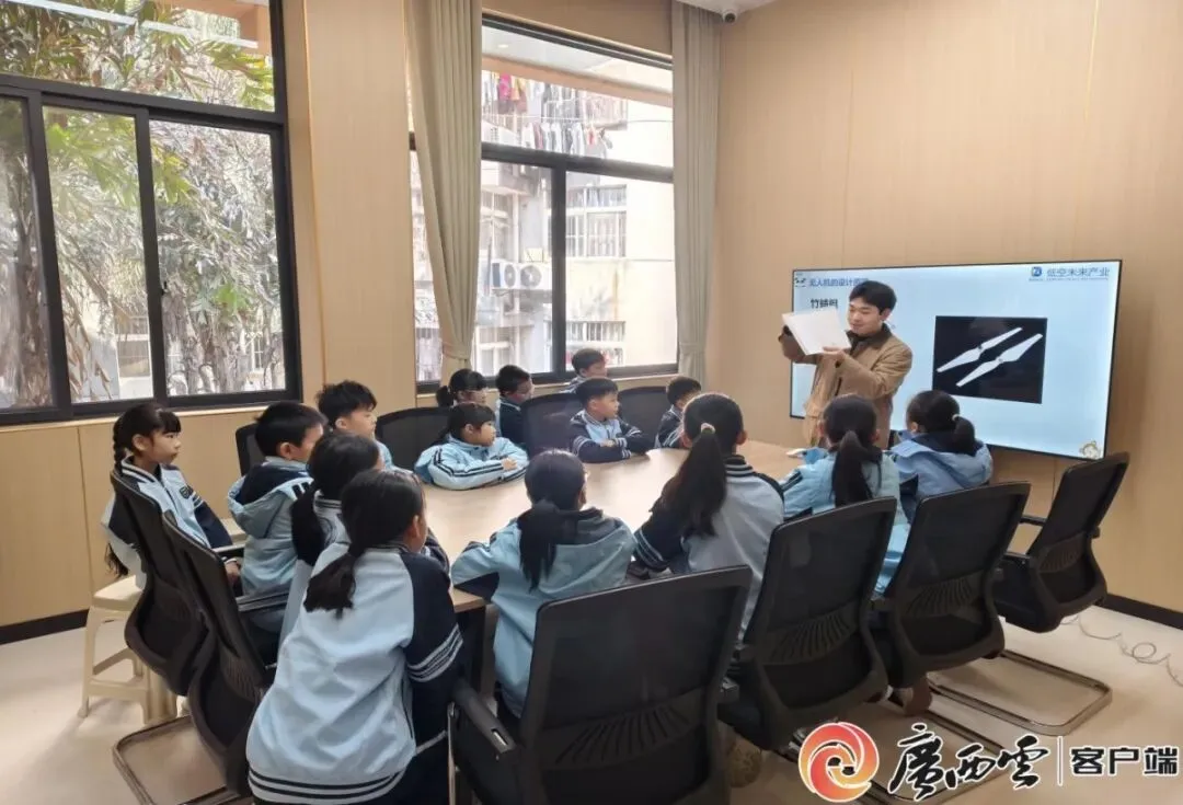 学生们在低空产业科普课堂上,认真聆听讲师讲解无人机原理。图源:青秀区中山街道人大工委