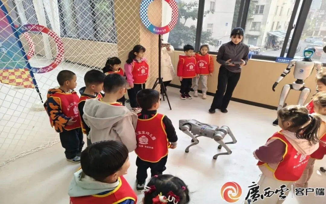 在科普课堂,孩子们正在围观机器狗与人形机器人的演示,近距离感受人工智能的趣味与魅力。图源:青秀区中山街道人大工委