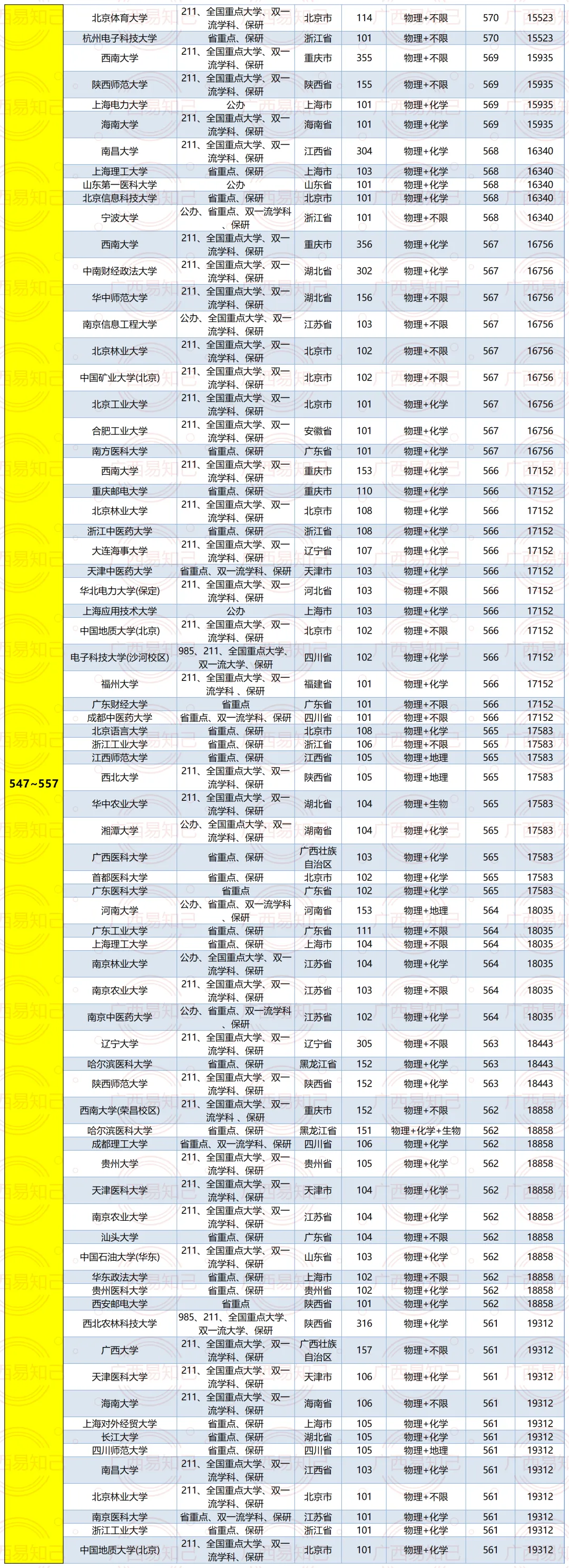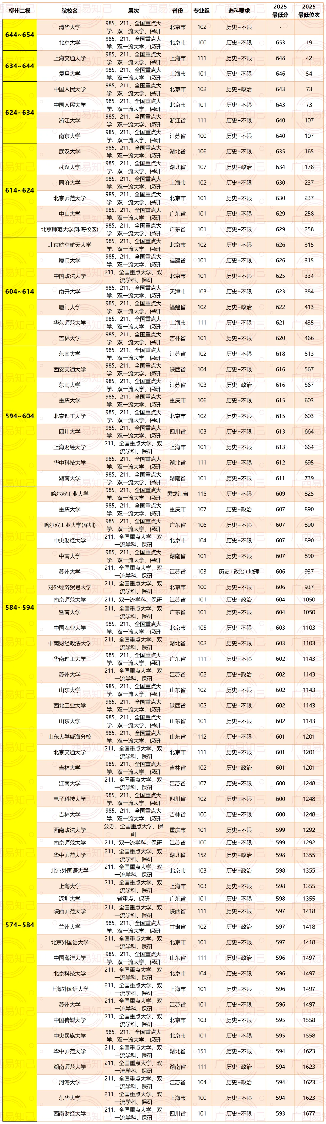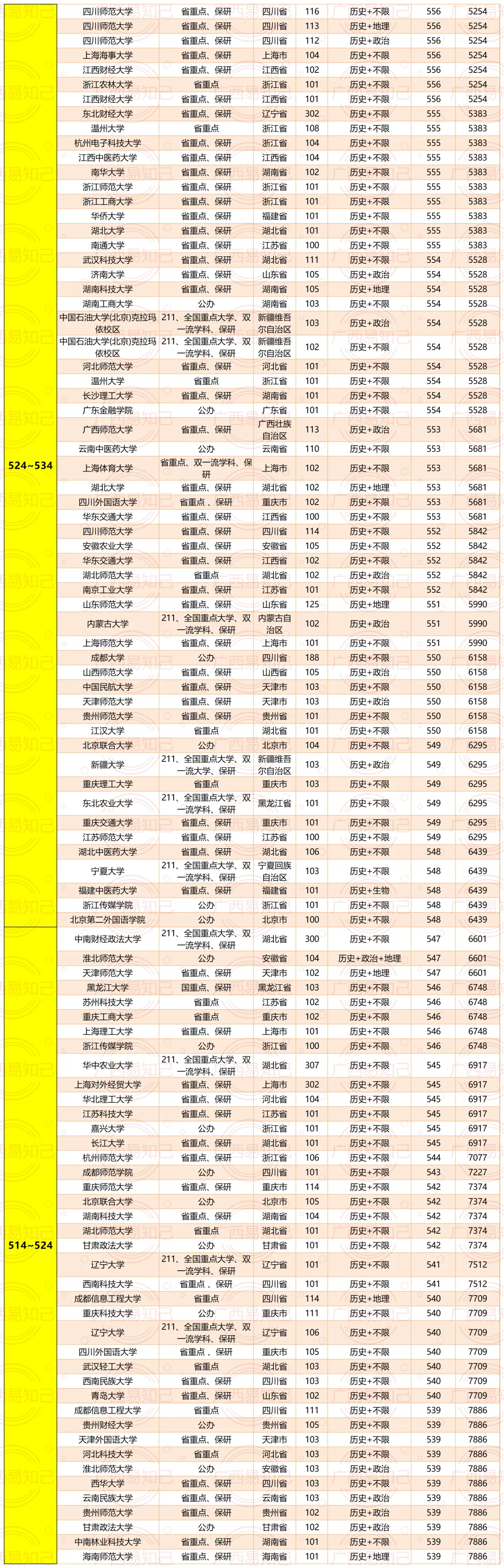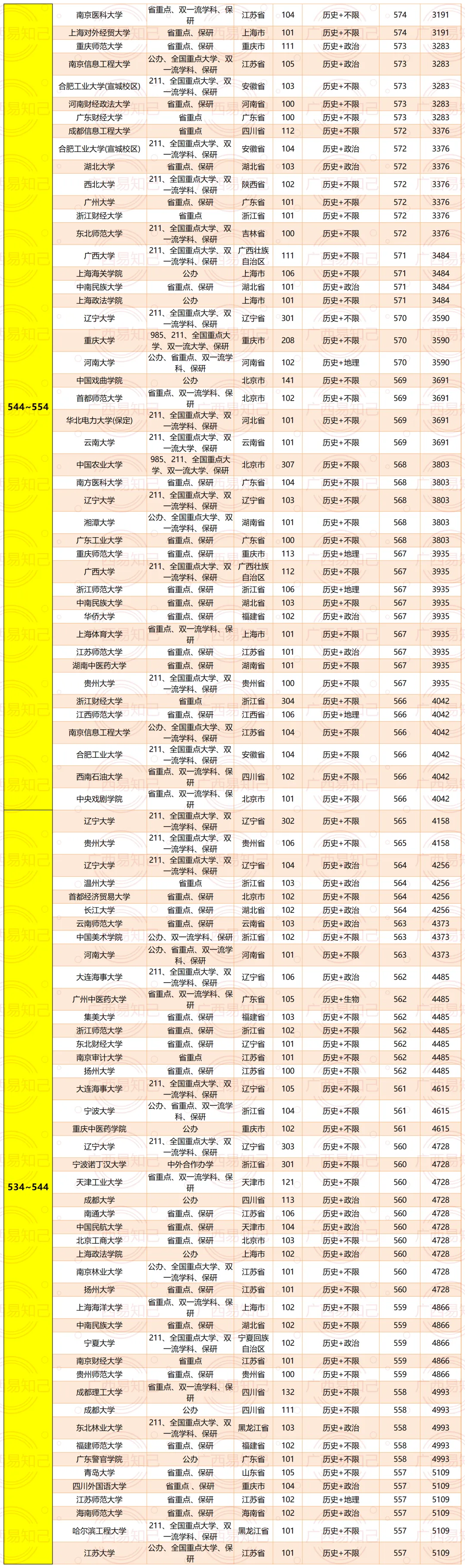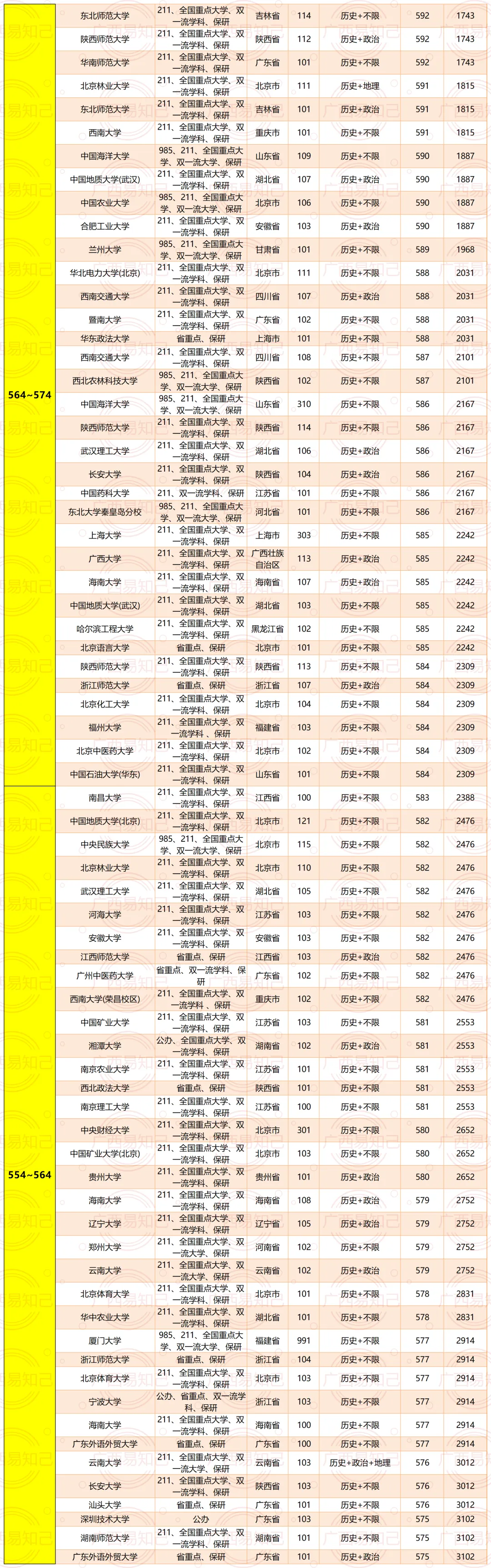 广西考生各个分数段可以读什么层次大学?广西易知己老师根据近3年广西的录取情况,给大家大概归纳了一下文理科各个排名的情况。具体如下