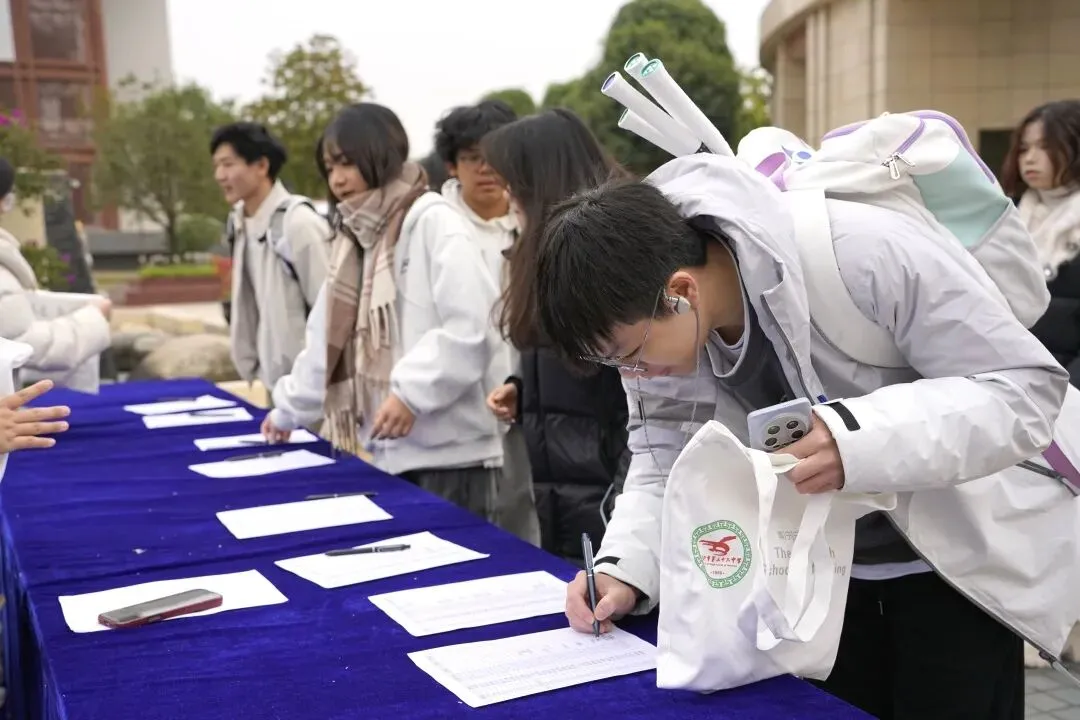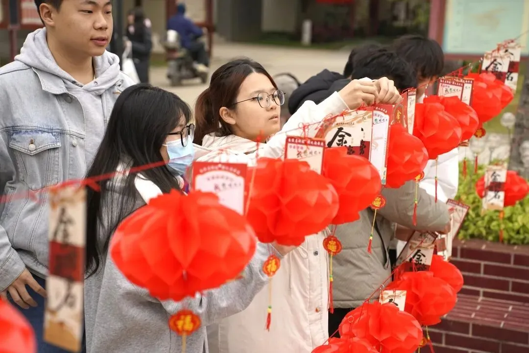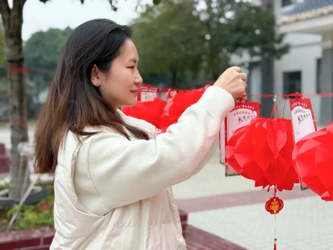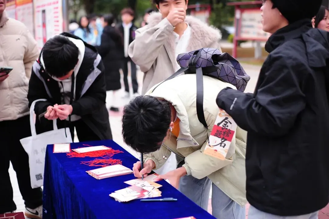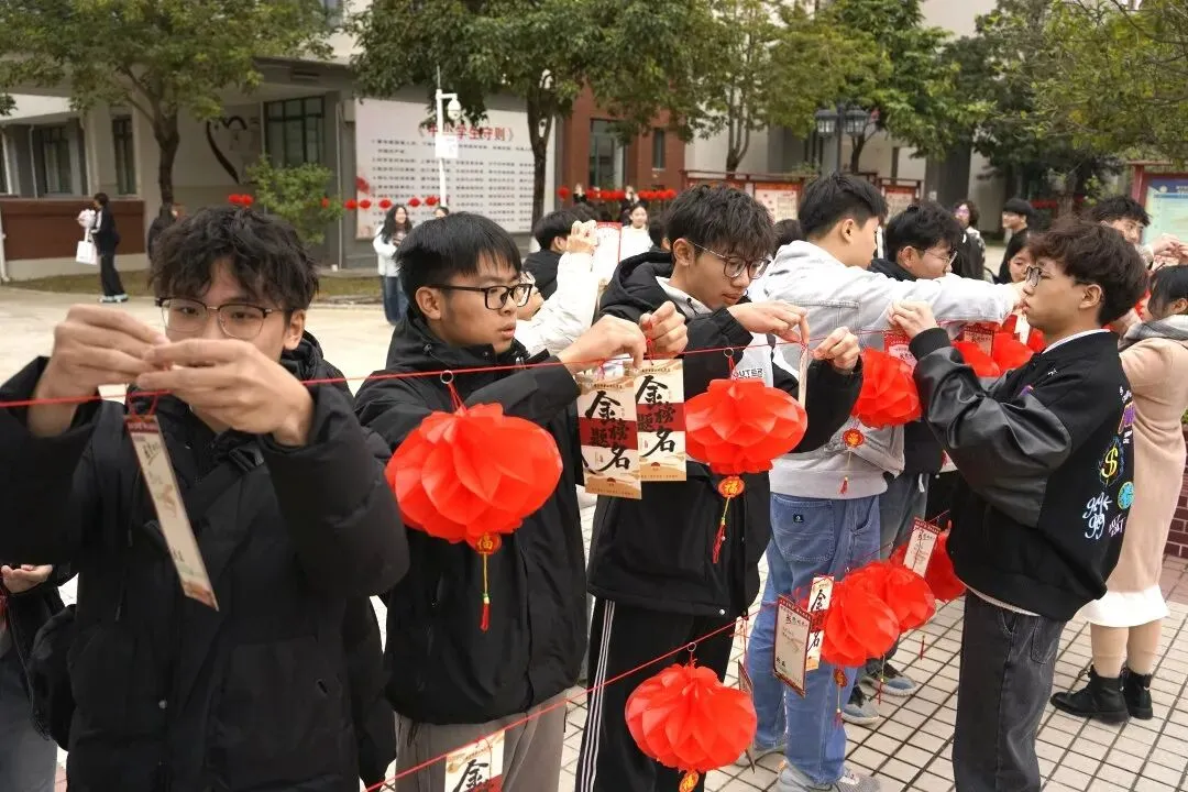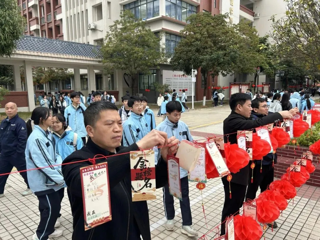 欢迎仪式落幕,温馨的“我为学弟学妹挂祝福”环节随即开展。校领导与返校学长学姐一同执笔,将对母校的眷恋、对学弟学妹的期许化作文字,书写在一张张祝福卡片上,小心翼翼悬挂于灯笼旁,让暖意萦绕校园。每一份寄语都传递正向力量,在校学子有序驻足品读,字里行间的鼓励与指引,成为滋养心灵的精神养分。