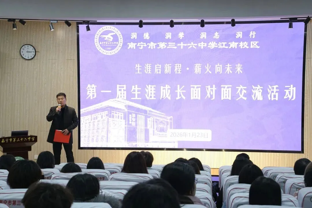 为搭建校友情谊桥梁,助力学子明晰生涯方向,传承六十余载办学底蕴,南宁市第三十六中学江南校区举办第一届“生涯启新程,薪火向未来”生涯成长面对面交流活动。从校领导的殷切嘱托到学长学姐的真诚分享,从高校资源的精准对接至温暖祝福的双向传递,这场活动为全校师生绘就了一幅立体鲜活的生涯探索画卷。