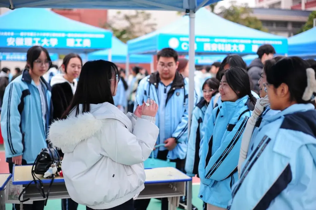 进班分享结束后,高校展位交流活动热闹开启。本次活动精心邀请多所高校布展,为学子提供高质量升学参考。现场人头攒动却秩序井然,同学们带着提前梳理的疑问,主动向学长学姐们询问专业内涵、录取要求与发展前景,在互动交流中明晰自身升学方向,为未来学业规划积累宝贵经验,充分展现了三十六中子弟勤学善思的良好风貌。