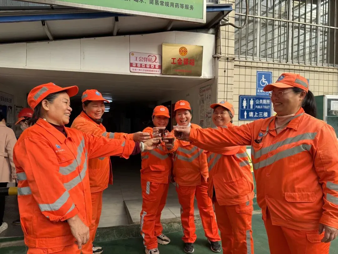 各工会驿站工作人员提前精心熬制好姜茶。驿站外设置的“暖心姜茶供应点”前很快排起长队,身着橙色工作服的环卫工人结束清晨清扫工作后,纷纷来到工会驿站有序领取姜茶。一杯杯暖饮驱散了冬日的寒意,每一个人的脸上都洋溢着幸福与满足。