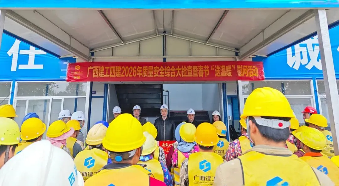 1月30日,广西建工集团总经理助理、四建公司董事长、党委书记伍转青带队到柳州分公司承建的综合楼项目开展2026年质量安全综合大检查暨春节“送温暖”慰问活动。四建公司副总经理饶耿参加。