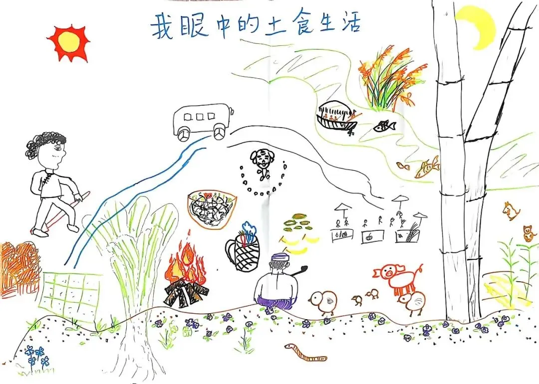 通过调研伙伴们发现,一碗生榨米粉的演变史,见证了当地历史与文化的转变,体现了当地人对技艺的坚守与创新,也是传统智慧与现代效率的博弈。有位伙伴在最后分享时,有感于食物与乡土的关系,与大家分享道:“我在圩市旁边,画了一个大碗和一个杯子,我想到我和伙伴们自带碗筷去赶集,探寻本地小吃生榨米粉的场景。每个人都有怀念的味道,怀念的不只是味道,还有乡土,以及被乡土滋养的记忆。这提醒我们,守住记忆中的乡土,我们不是看客,传递好这些故事,做好代际传承,增加孩子对乡土的理解,是我们可以做的。”
