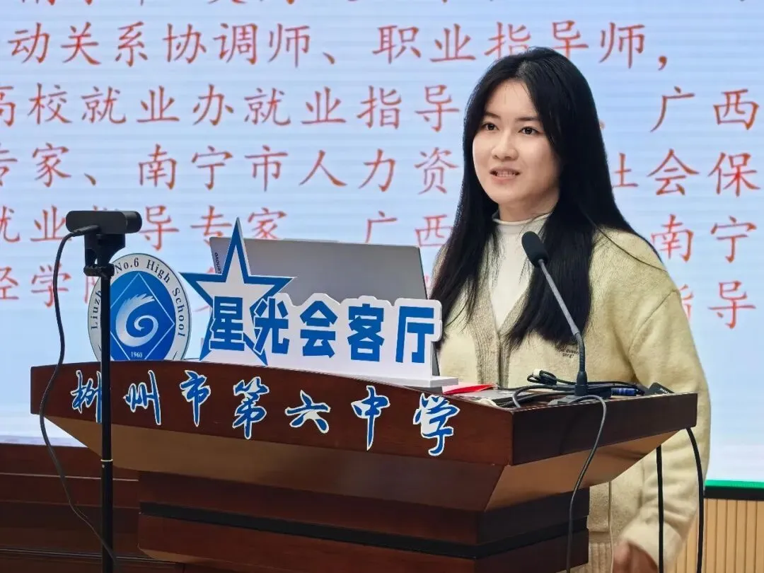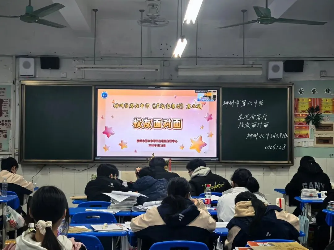 2026年1月28日晚,柳州市第六中学《星光会客厅》第二期“校友面对面”活动温情启幕。本次会客厅特邀柳州市第六中学杰出校友、中智广西人力资源服务有限公司总经理韦婕重返母校,以自身成长感悟与深耕行业多年的实战经验,为高一、高二年级全体学生带来了一场干货满满的职业规划分享。活动由徐诗媛老师主持,陈嘉颖校长、蒲海燕副校长、学生发展中心文雯主任出席,师生齐聚共赴成长之约。