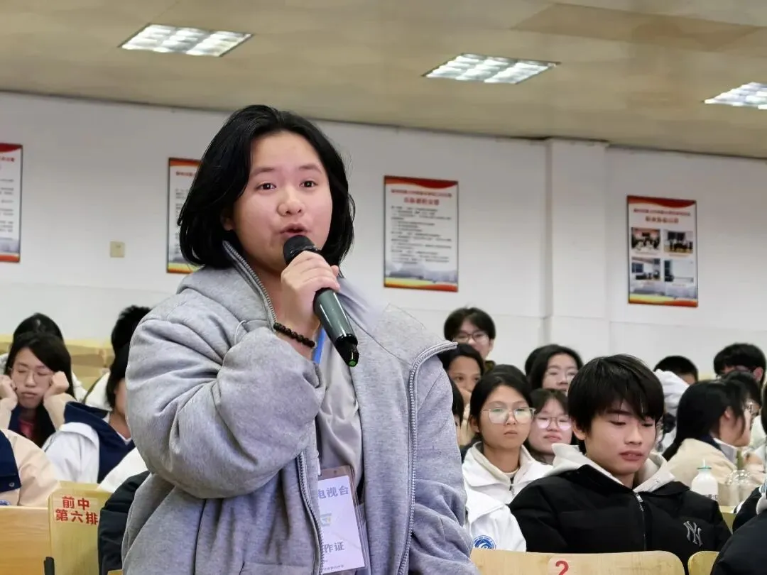 互动环节暖意融融,同学们围绕职业规划、挫折应对踊跃发问。2519班唐胡杰聚焦销售岗位规划,韦婕回应:“当以客户需求为锚,明晰产品优势、借市场调研找准竞争力支点,让行动靶向精准。”2405班莫家睿叩问挫折应对之道,她以中考困境与坚守为例,用“与其被照亮,不如成为自己的光”“人生除了生死,其他皆为擦伤”共勉,鼓励学子将经历沉淀为成长养分。