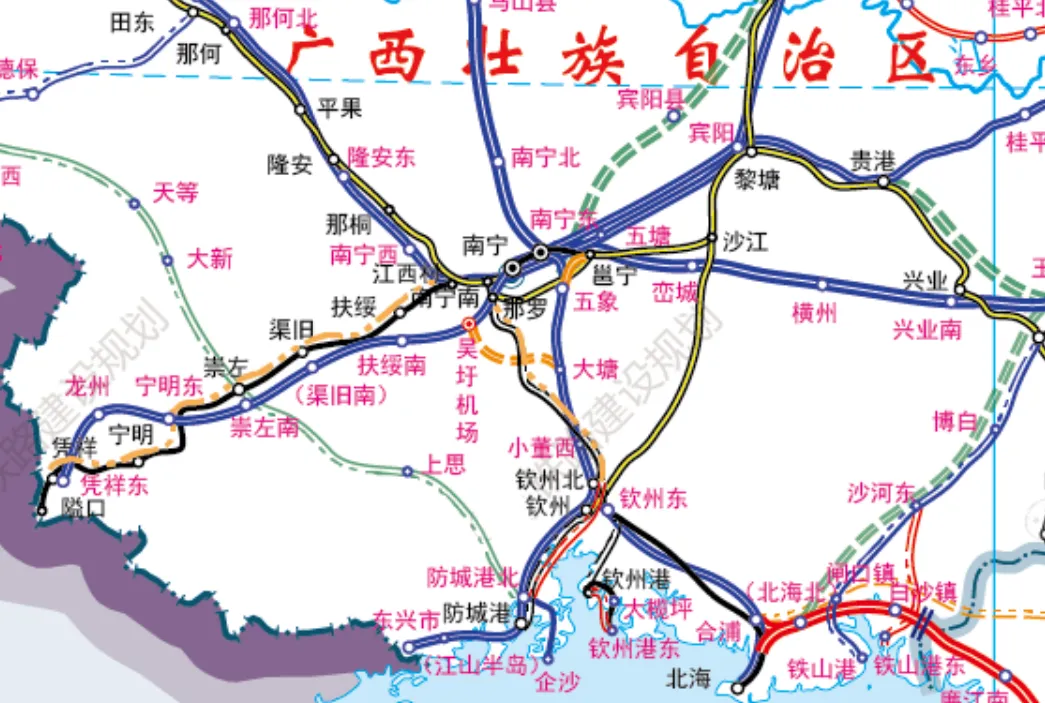 作为南防铁路扩能改造的重要组成部分,该项目被纳入《广西综合交通运输发展“十四五”规划中期评估和调整报告》储备项目,需指出的是南防铁路钦州至防城港段增建二线已开工,而南宁至钦州段为单独储备项目,旨在破解既有南防铁路北段货运能力饱和难题。