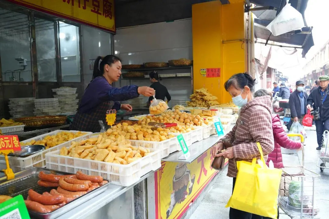 清晨的南宁淡村农贸市场,早已被烟火气裹满。吆喝声、剁肉声与蒸笼热气交织,包子刚出炉的甜香漫过街巷,现蒸卷筒粉裹着黄皮酱的醇厚,刚炸好的油堆滋滋冒香唤醒整座城。