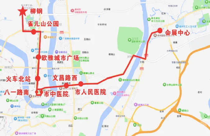 2、回程(柳州国际会展中心~柳钢):从柳州国际会展中心发车,经新柳大道、桂柳路、文昌路、文昌大桥、广场路、八一路、跃进路、胜利路、北雀路至柳钢。沿线停靠的站点有:会展中心、市人民医院、文昌路西、广场路、火车北站、欧雅城市广场、雀儿山公园、柳钢。