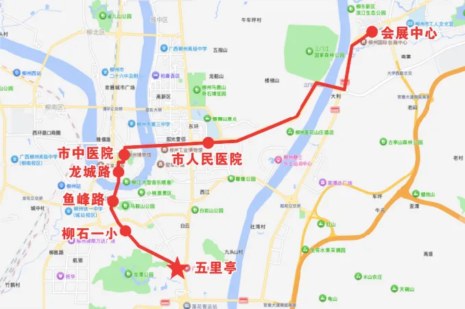 1、去程(五里亭~柳州国际会展中心):从五里亭站发车,经柳石路、鱼峰路、龙城路、解放北路、文昌路、桂柳路、新柳大道至柳州国际会展中心。沿线停靠的站点有:五里亭、柳石一小、鱼峰路、龙城路、市中医院、市人民医院、会展中心。
