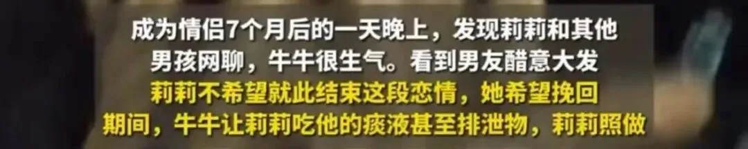 当日,在牛牛校外租住的房间里,他偶然看到莉莉与一位游戏网友的聊天记录,顿时醋意大发 。为了挽回感情,莉莉虽解释双方并无出格交流,但仍选择顺从男友以平息其怒火。然而,她等来的却是一系列残忍的“惩罚”。牛牛逼迫莉莉吞食自己的痰液甚至排泄物,还扇她耳光 。此后,莉莉又多次遭受折磨 。3月19日,她被烟头烫伤手臂和后背,23日,烫伤范围扩大至大腿内侧甚至胸部 。24日凌晨,牛牛还带莉莉去纹身店,在其手臂上纹上一只小狗图案并配文“牛牛'S”,将莉莉视为自己的“宠物” 。