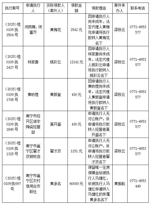 公示期间,案件当事人或其他利害关系人如对执行案款发放给案外人有异议的,应提交书面意见并附证据材料,由本院审查处理,联系电话0771-4717428;公示期满且无异议的,本院将按照执行案款管理有关规定发放上述案款。