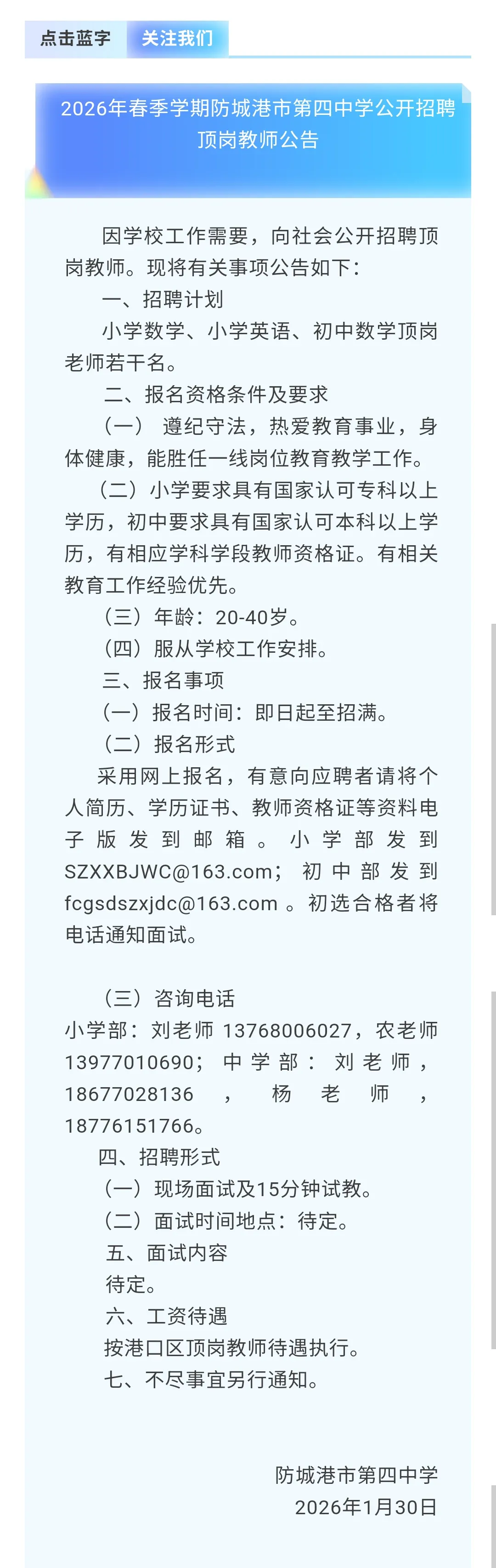 防城港教师招聘:防城港第四中学招聘