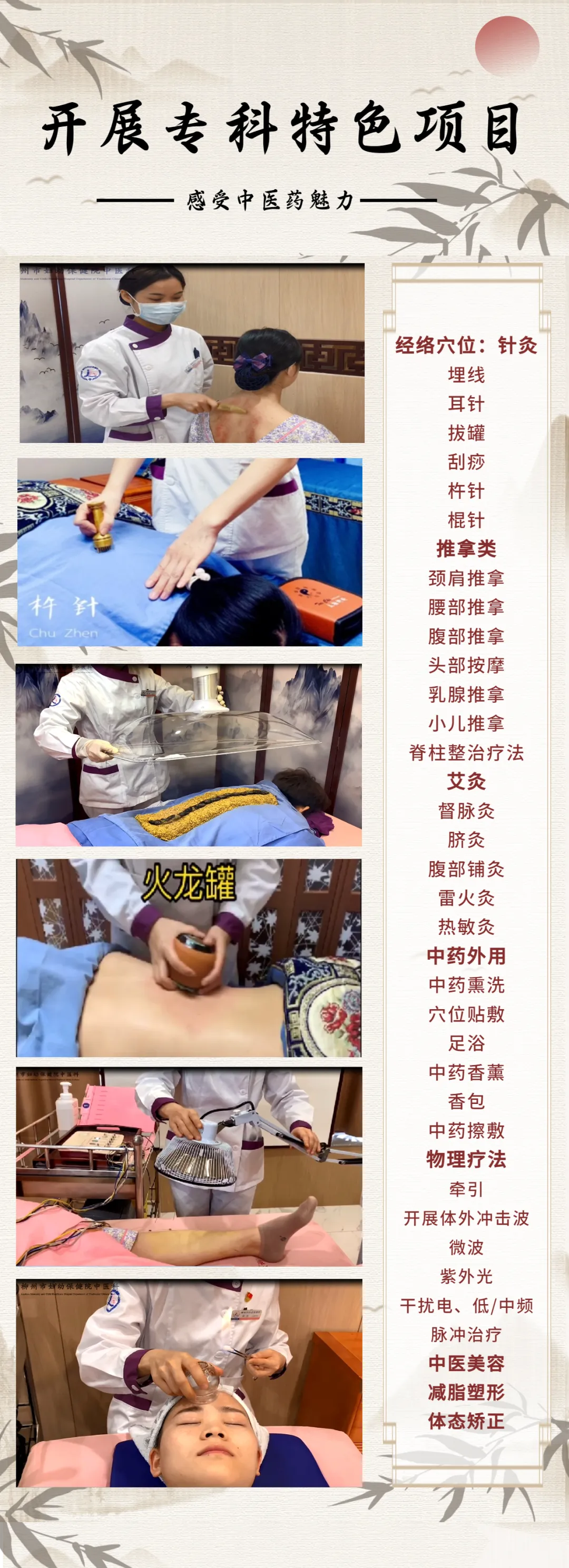 中医科的四大重点专科人员结构合理,针灸推拿核心技术团队传承有序,重视合理运用中医外治及理疗提高专科临床疗效。开展有针灸、推拿(含小儿推拿,妇科病推拿,各流派手法)、火针、小针刀、穴位埋线、药物贴敷、药线点灸、磁疗针、火罐、药物罐、穴位注射、耳针、中药灌肠等40余种中医特色疗法。理疗设备齐全,配备有红外热成像仪、子午流注仪、中低周波、微波、冲击波、超短波、激光、海特光、紫外光、机器人牵引仪、脉冲磁治疗仪、骨质疏松治疗仪、中频脉冲治疗仪等中医理疗仪器设备,提高了临床治疗方法选择的多样性。