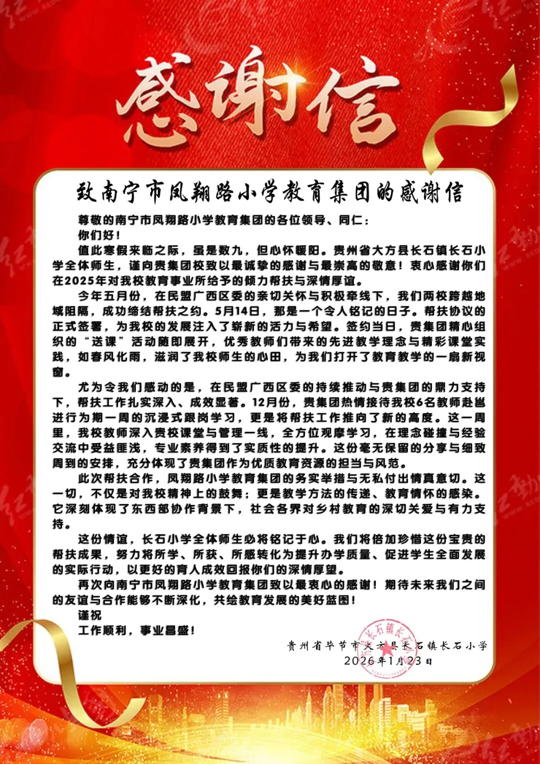 我们与贵州毕节市长石镇长石小学、广西大新县下雷镇中心小学、天等县恒丰希望小学等4所学校建立结对帮扶关系,构建“理念共享、资源共用、师资共培、质量共进”机制。通过送教下乡、跟岗学习、资源共享等方式,让优质教育的种子飞越千山,播撒到更多需要的地方。
