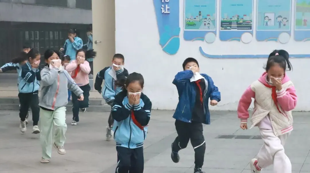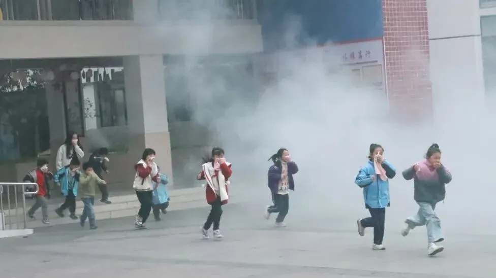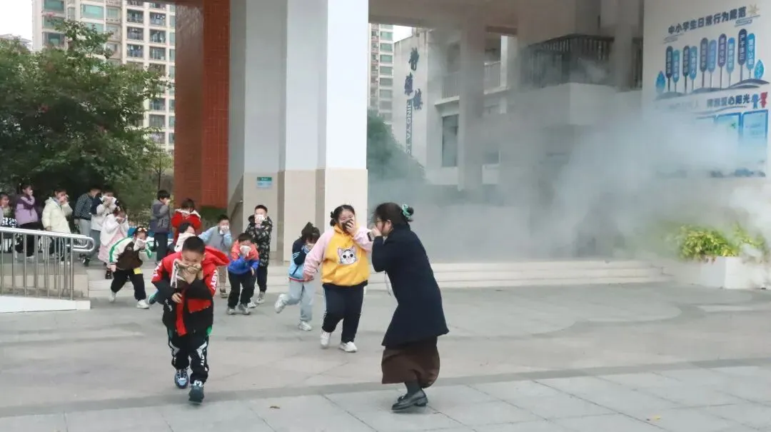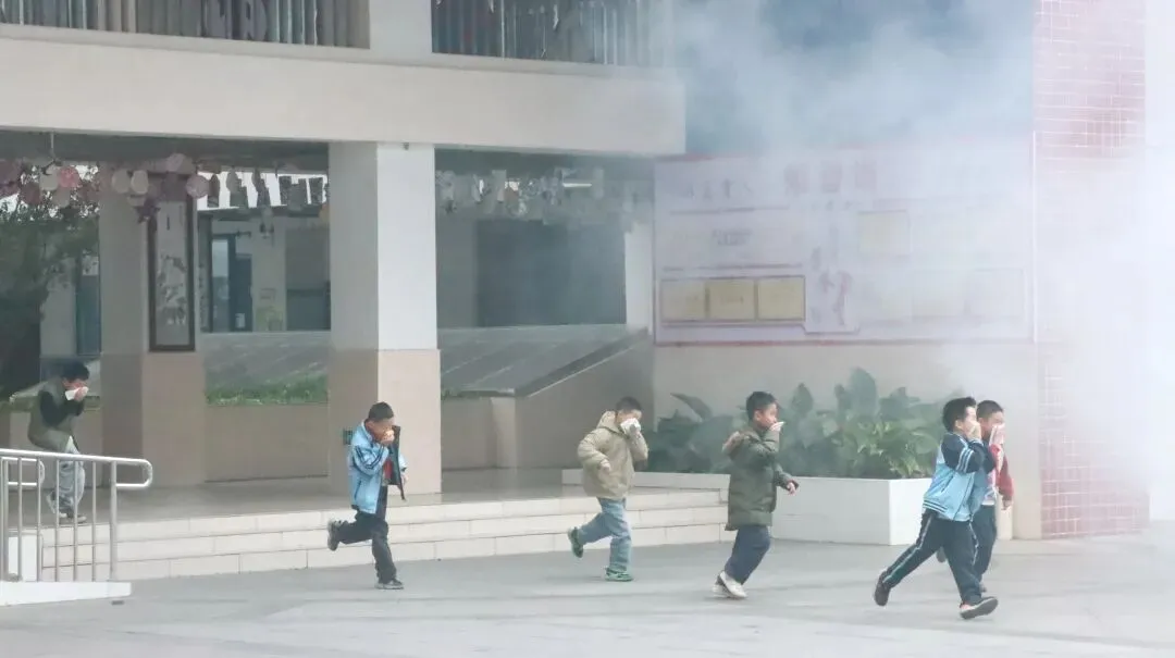 随着警报声响起,消防逃生演练拉开典礼的序幕。全体学生在老师的有序引导下,用小毛巾捂住口鼻,弯腰低姿快速疏散至操场安全区域,整个过程紧张有序、规范高效。