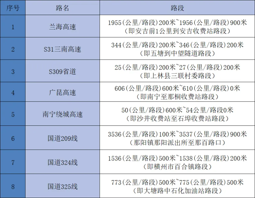 南宁收费站、安吉收费站、安吉东收费站、坛洛收费站、宾阳南收费站、宾阳收费站、苏圩收费站等9个收费站易发生拥堵缓行。
