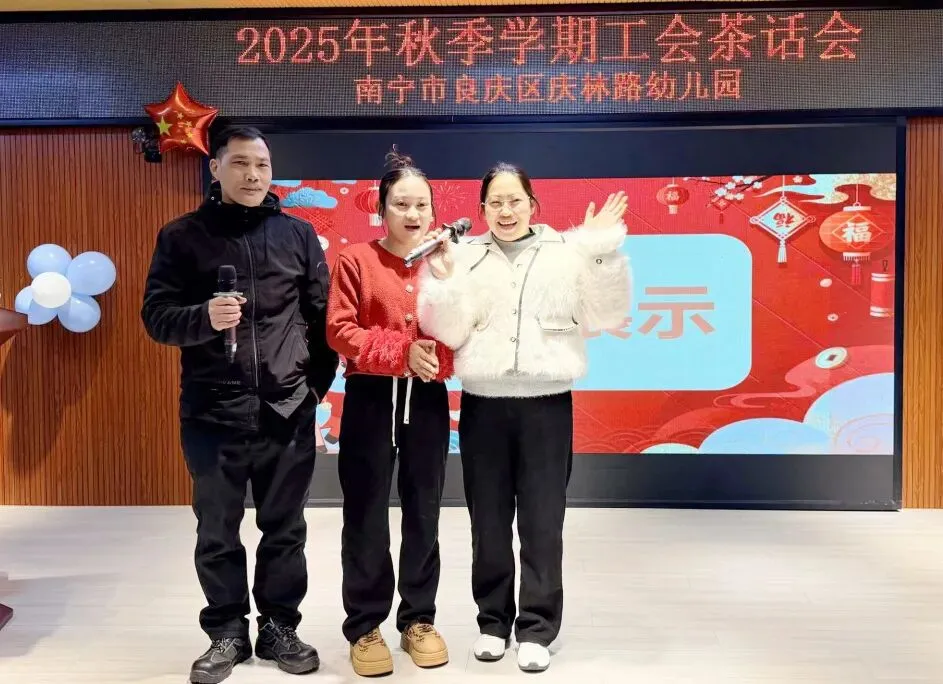三位“幸运之星”登台献艺,《新年好》的清甜旋律,不仅展现了庆林教职工的多才多艺,更让现场暖意倍增,掌声与笑容交织成最温暖的画面。