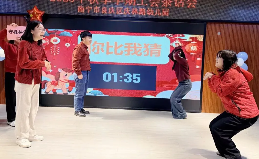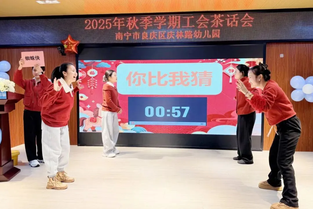 互动游戏环节好戏连台,后勤组、小班组、中班组、大班组四支队伍同台竞技,默契与智慧碰撞出无限火花。“你比我猜”中,老师们用生动的肢体语言传递信息,精准配合解锁一个个词汇。
