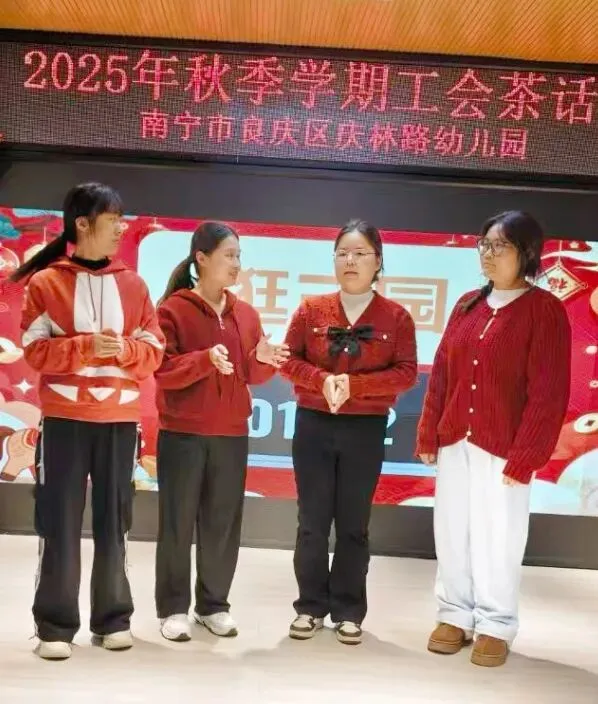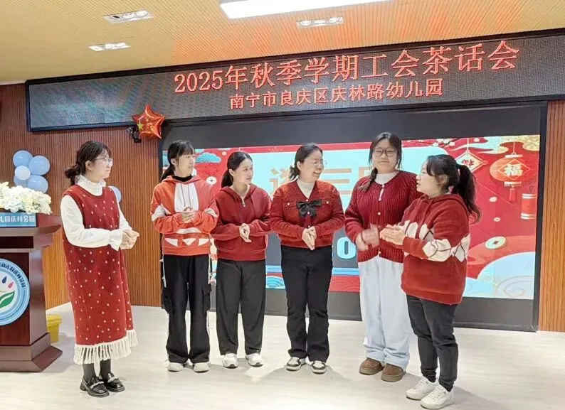 茶话会的尾声,冯老师向全体教职工致以诚挚的新年祝福。她回望秋季学期的温暖历程,向默默坚守岗位的带班老师、后勤团队致以诚挚感谢——感谢老师们用爱心陪伴孩子成长,感谢后勤叔叔阿姨筑牢校园安全与健康防线。最后,冯老师送上新年祝福,承诺党支部与工会将始终做大家的坚强后盾,愿全体庆林家人同心同德、阔步前行,共同书写幼儿园发展的新篇章。