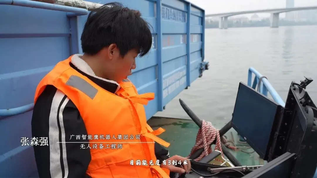 广西智能鹰机器人集团公司无人设备工程师张森强:“目前能见度有3-4米,抽水口无堵塞无破裂,一切正常”。