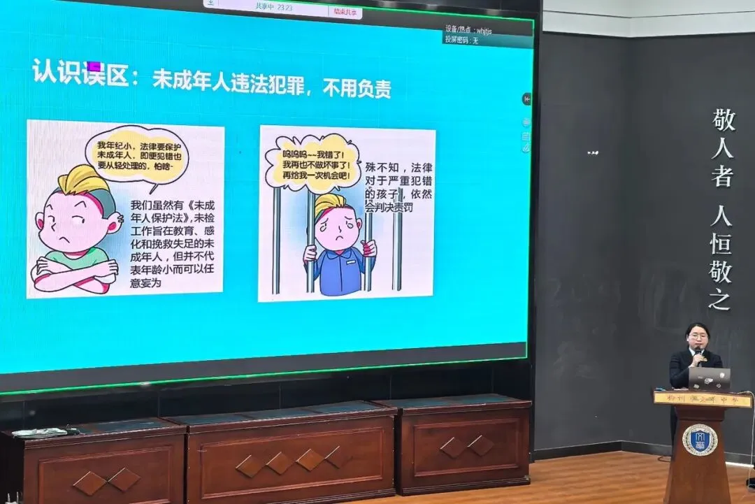 本次讲座紧密围绕未成年人成长过程中的法律风险与行为边界展开,系统阐释了刑事责任年龄的认定标准、违法与犯罪的本质区别、严重不良行为的法律后果等重要内容。主讲人结合本地真实案例,深入剖析了未成年人因心理偏差、环境影响而逐步滑向违法犯罪的内在路径,明确指出法律绝不是未成年人的“免责盾牌”,并呼吁家庭、学校与社会应当共同携手,关注青少年的行为与心理状态,及时引导,筑牢预防之网。