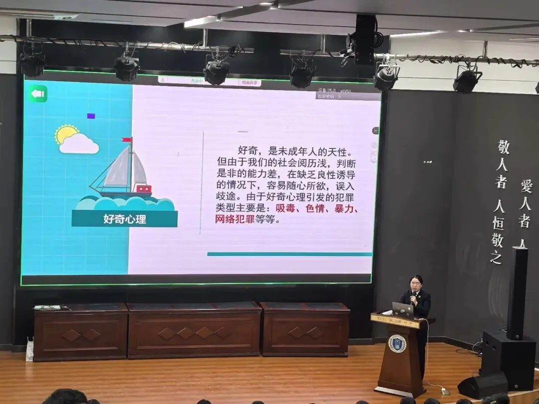 讲座最后发出郑重呼吁:法律既是保护青少年健康成长的“保护伞”,也是一条不可触碰的“高压线”。希望同学们能牢固树立正确的价值观,增强自我约束能力,遇到矛盾与困难时主动向家长、老师或心理咨询师寻求帮助,坚决抵制以暴制暴和盲目跟从,用理智与法律守护自己的青春之路。
