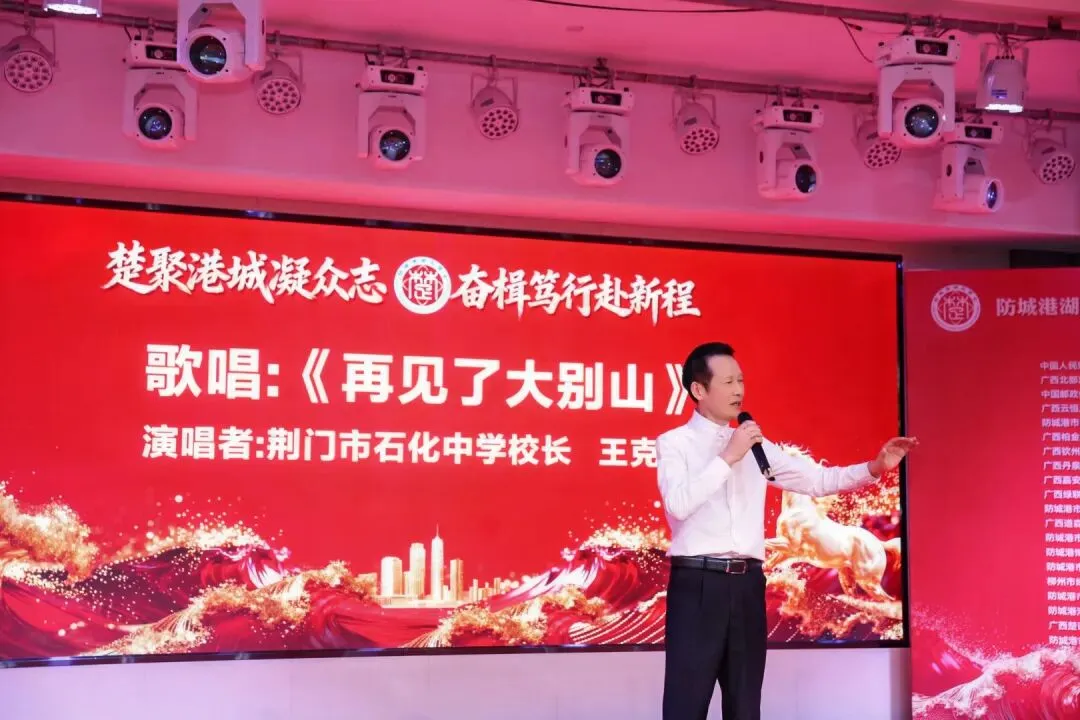 本次年会既是一场乡贤团聚的温情盛宴,更是商会凝心聚力的新起点。现场高朋满座,氛围热烈非凡:领导致辞擘画发展蓝图,新一届理事会庄严就职,坚守“团结、诚信、服务、发展”宗旨,誓要深化鄂桂经贸交流,助力楚商扎根北部湾、扬帆新征程;精彩文艺节目轮番上演,楚商风采尽情绽放——尤为令人动容的是,荆门市退休干部亲临现场,以两首经典歌曲《洪湖水浪打浪》《再见了,大别山》献礼年会,熟悉的旋律承载着楚乡记忆,醇厚的歌声传递着赤子情怀,唤起了全体与会乡贤的深深共鸣,将现场氛围推向温情高潮。